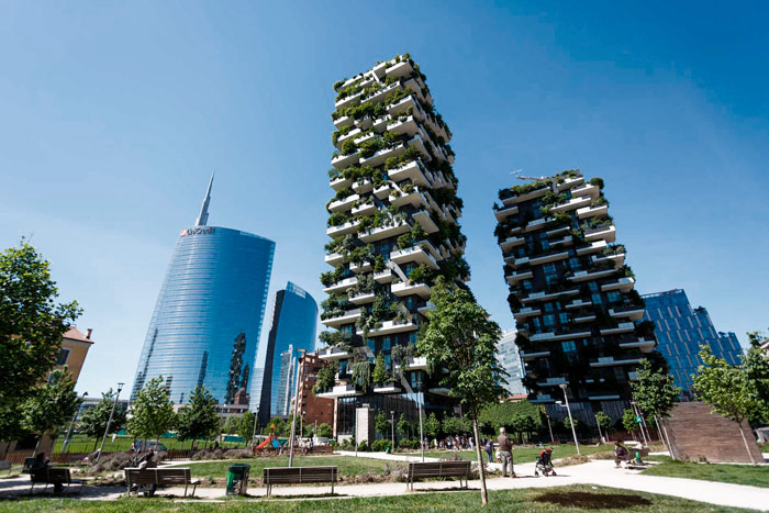 El más famoso ejemplo de esta arquitectura es su Jardín Vertical de Milán, dos torres de lujo de 80 y 112 metros que albergan lo que sería un equivalente a 30.000 kilómetros cuadrados de bosque en sus fachadas.