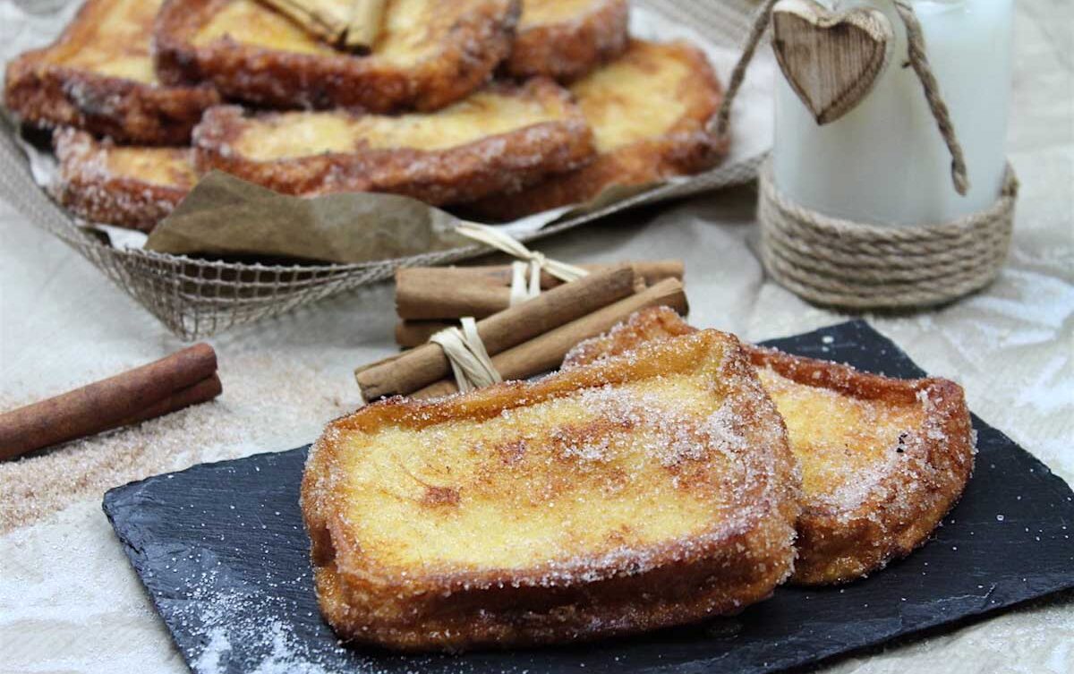 Torrijas, un dulce de origen europeo pero de larga tradición en España. Consiste en una rebanada de pan (habitualmente no del día, ya algo duro) que es empapada en leche o vino y, tras ser rebozada en huevo, se fríe en una sartén con aceite. Se endulza con miel, melaza o azúcar y es aromatizada con canela. Es similar a la tostada francesa. En mi casa se hacen mucho y hay tejemanejes de tuppers toda la semana. Placeres culpables y gozosos en familia.